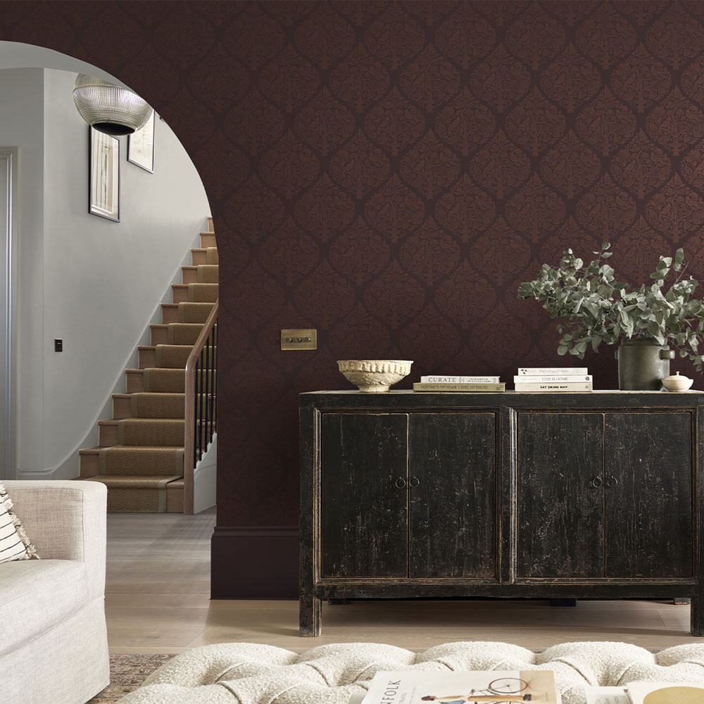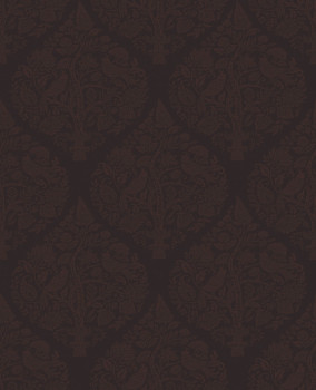 Non-woven wallpaper, matte dark burgundy background, semi-gloss ornamental pattern featuring plants and birds.