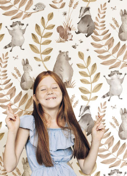 Playful children's non-woven wallpaper featuring animals and leaves, with a white background; the animals are in shades of brown and gray, and the leaves are pink and gold.