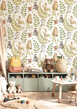 Playful non-woven wallpaper for children's rooms, featuring animals and leaves, with a white background; the animals are in shades of gold, brown, and gray, and the leaves are green and gold.