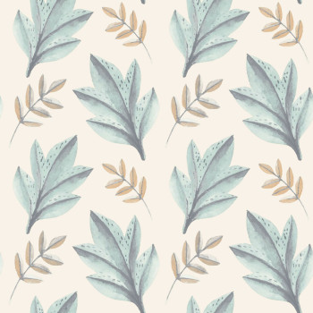 Smooth non-woven wallpaper, white background, larger blue leaves 20 cm long, smaller gray-gold leaves 15 cm long.