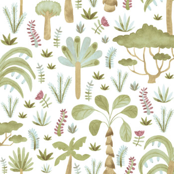 Children's non-woven wallpaper, tropical plants, white background, plants in green, blue, brown, and purple.