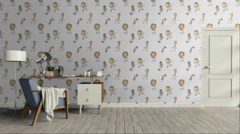 Playful children's non-woven wallpaper, white background, animals in a combination of gold, beige, and brown, black-and-white balls.