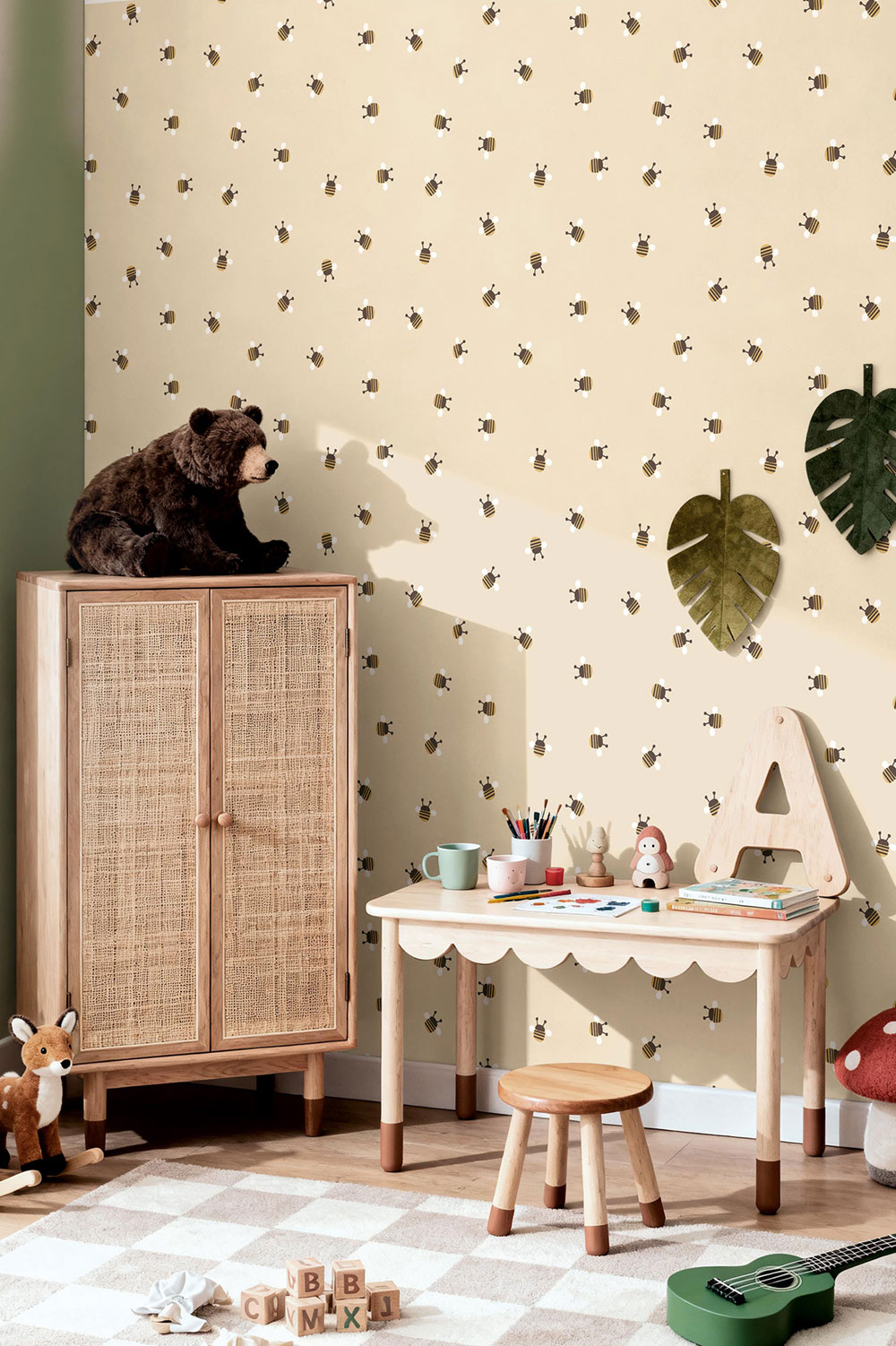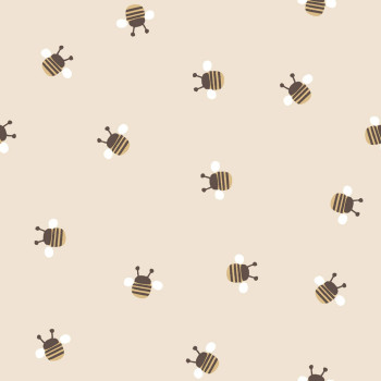 Cute children's non-woven wallpaper, bees, beige background, bees in brown, gold, and white.