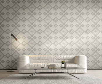 Gray non-woven wallpaper with a silver sheen and a geometric pattern in brown.