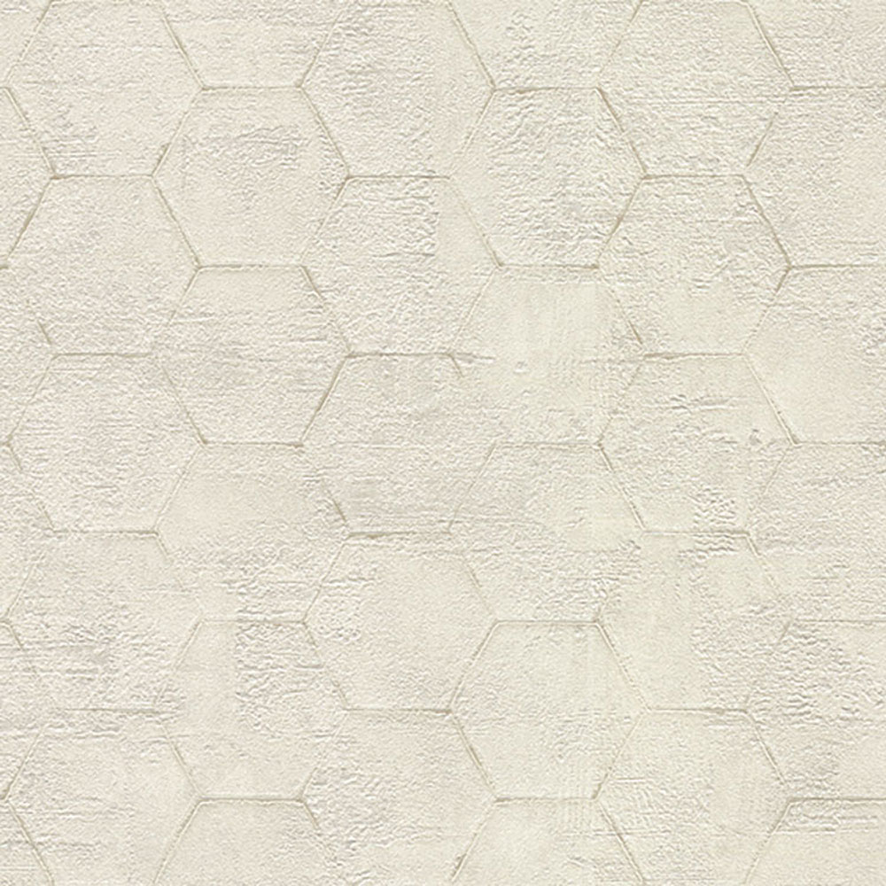 White non-woven wallpaper with a soft sheen and hexagon pattern.
