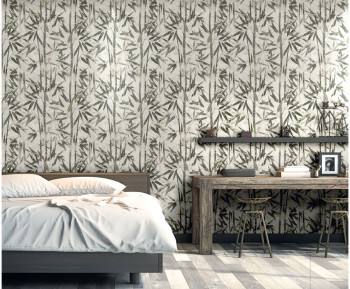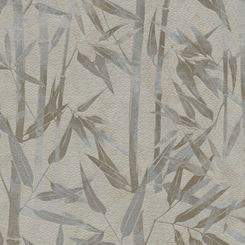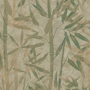 Beige non-woven wallpaper with a geometric background and a green metallic bamboo pattern.