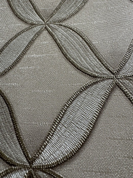 Luxury non-woven wallpaper is beige with a silvery pattern, gold outlines, fabric texture.