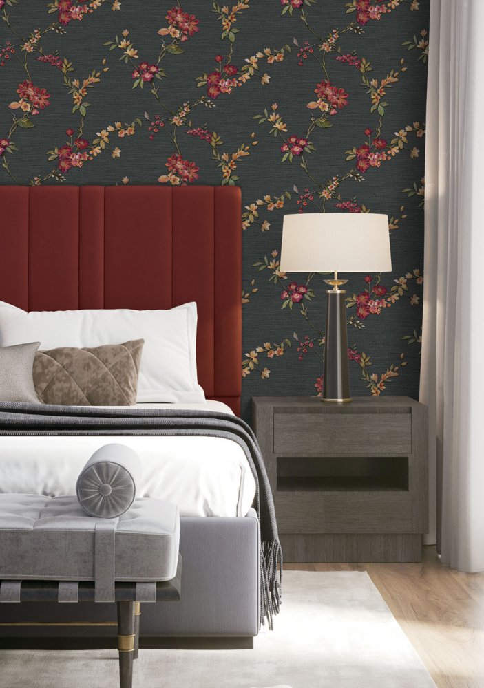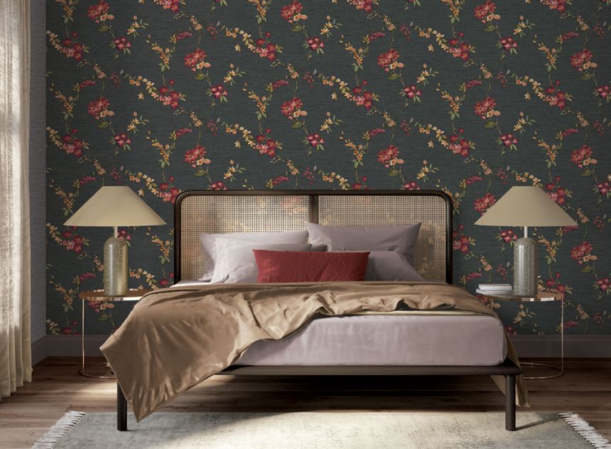 Luxurious non-woven wallpaper with a black background and metallic burgundy flowers.