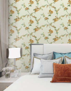 Luxury non-woven wallpaper with light beige background and metallic orange flowers, fabric texture.