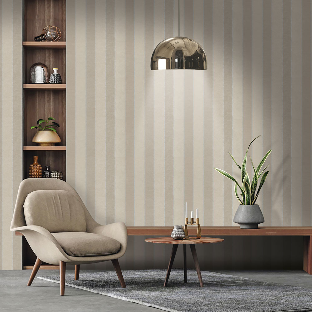 Non-woven stripes wallpaper. Wallpaper is brown-beige, silver dividing stripes.