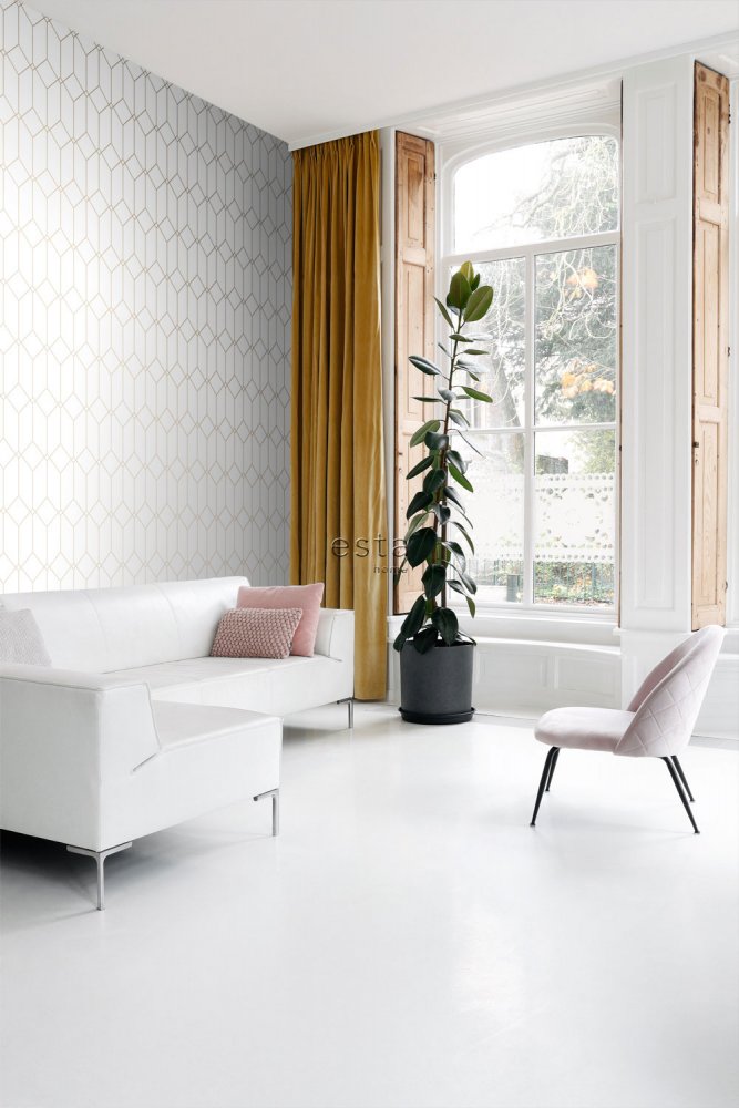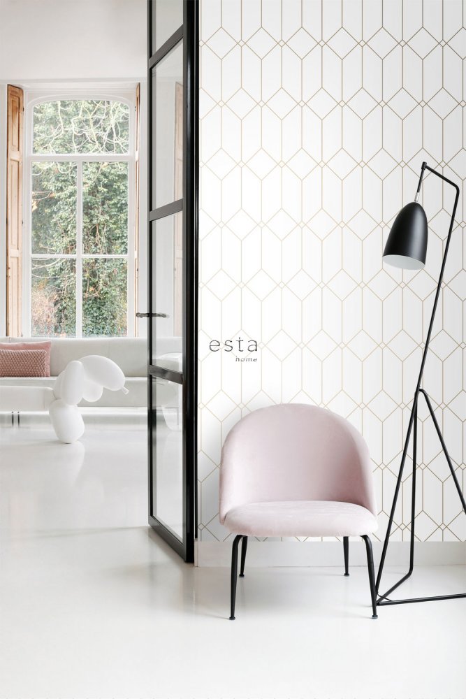 White geometric non-woven wallpaper, golden lines 139223, Art Deco, Esta