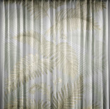 Luxury non-woven 3-piece decorative wallpaper mural with a pattern of tree leaves on a background with a pattern of a wavy fabric. The wallpaper is in gray shades with green leaves. Can be combined with pattern Z64861