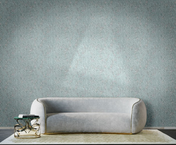 Luxury non - woven wallpaper with a vinyl surface with an unusual pattern - waves and leaves in a green-blue shade with a silver pattern of twigs with flowers and leaves.