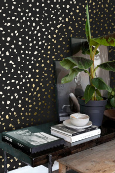 Non-woven black geometric wallpaper with golden irregular shapes.