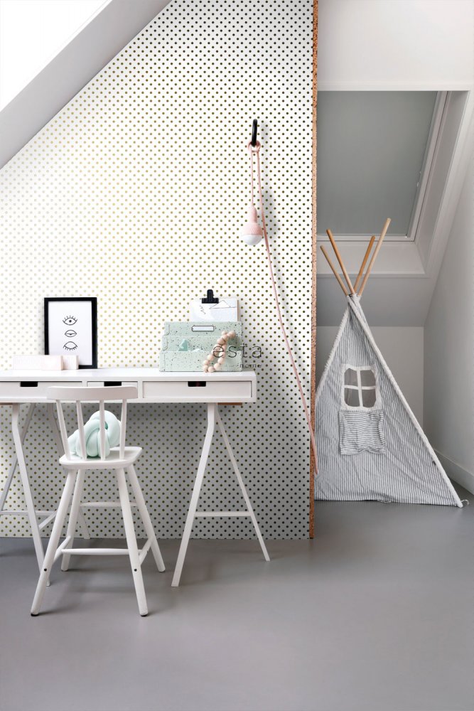 White non-woven wallpaper with gold polka dots 139113, Black & White, Esta