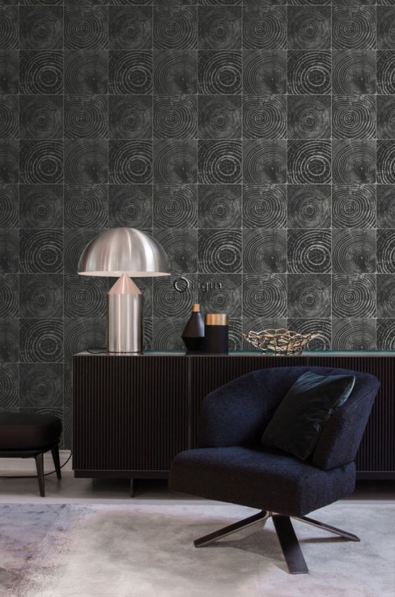 Black and silver non-woven wallpaper, imitation wood with annual rings 347544, Matières - Wood, Origin