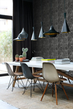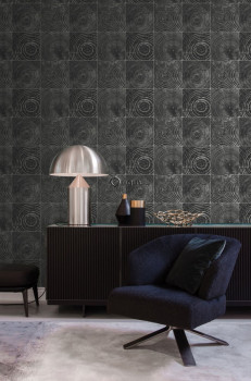 Black and silver non-woven wallpaper, imitation wood with annual rings.