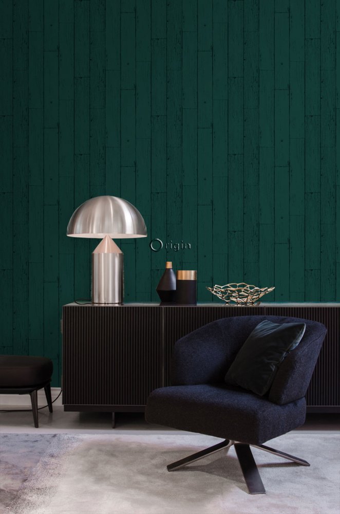 Green-black non-woven wallpaper imitation wood, boards 347536, Matières - Wood, Origin