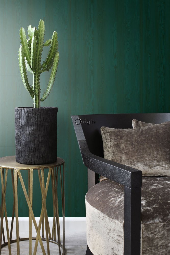 Metallic green non-woven wallpaper, wood imitation, fine texture.