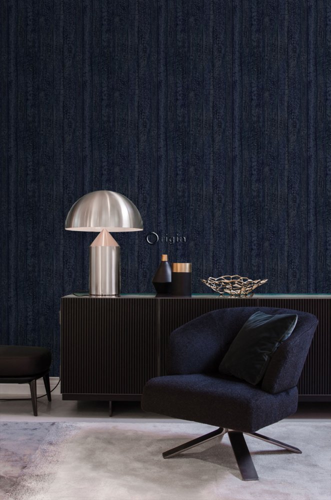Dark blue non-woven wallpaper, wood texture pattern.