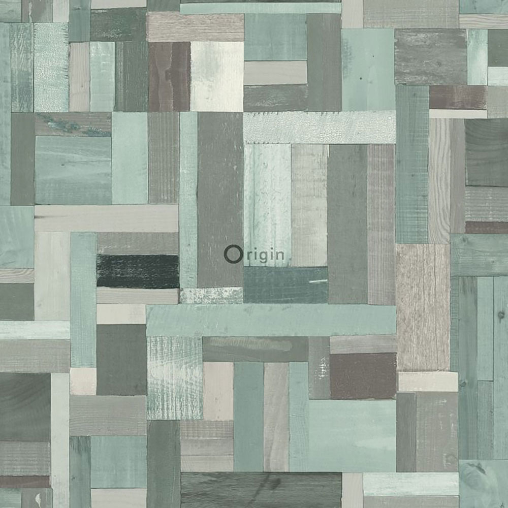 Non-woven wallpaper, imitation wood paneling in shades of green and gray. The wallpaper has a glossy smooth surface.