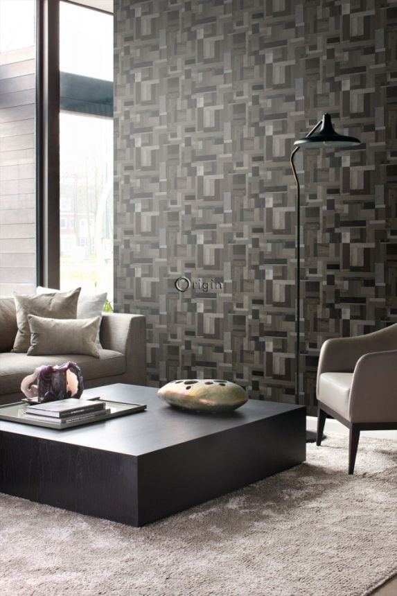 Non-woven wallpaper, imitation wood paneling in shades of gray, black. The wallpaper has a glossy smooth surface.