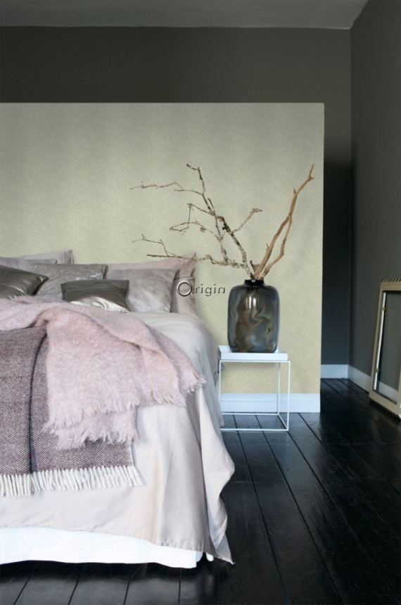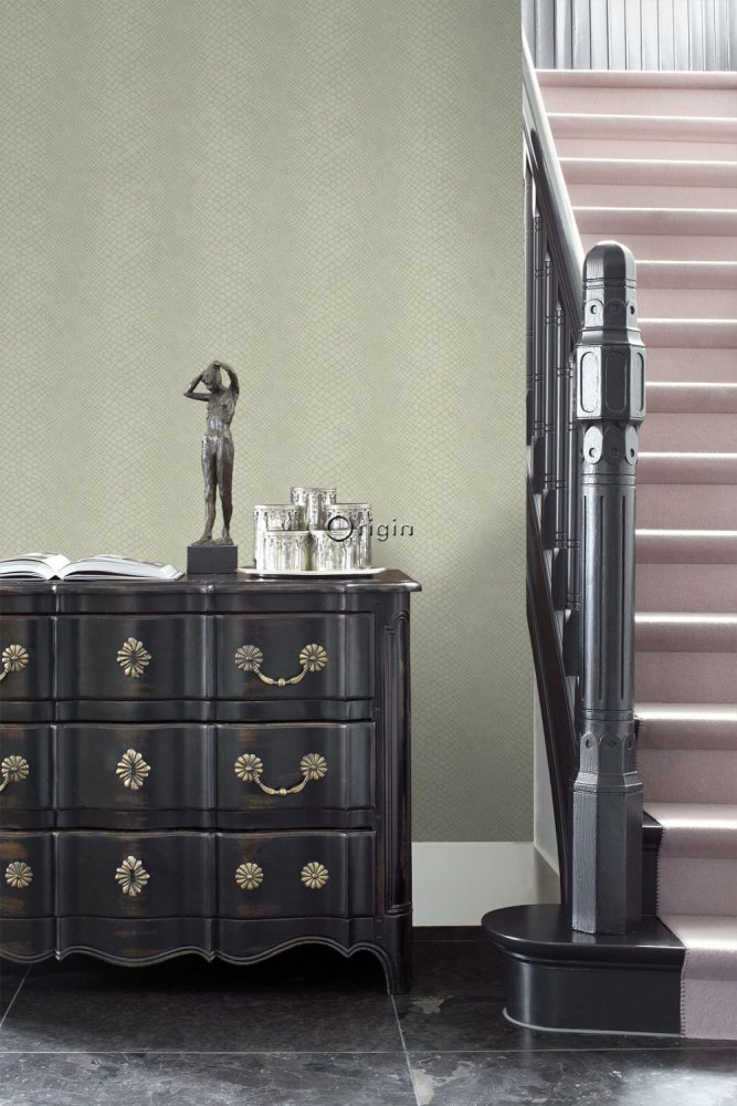 Non-woven gray-green wallpaper, imitation snakeskin.