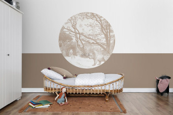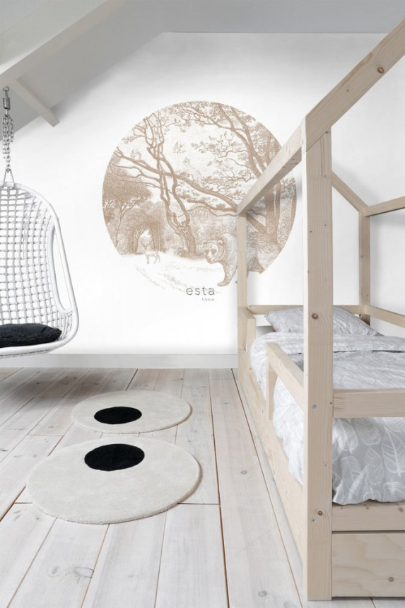 Self-adhesive circular wallpaper, brown drawing of forest, forest animals - bears, fox, badger, deer.