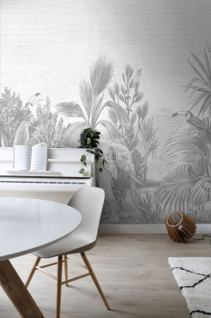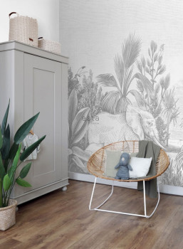 Non-woven wall mural, gray drawing of jungle, elephants, palm trees.