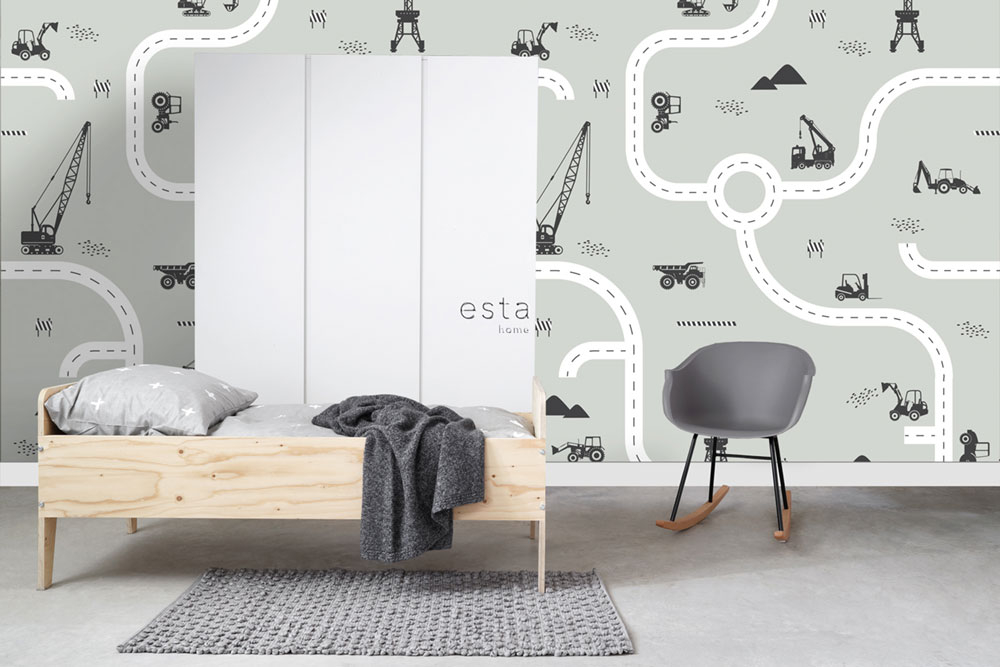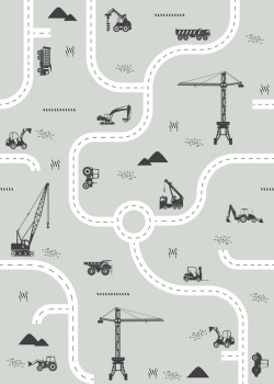 Non-woven wall mural for boys, motif of roads, tractors, cranes and trucks. The wallpaper has a follow-up pattern, for a larger width just buy another piece.
