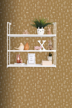 Dark ocher non-woven wallpaper, white pattern of flowers and plants.