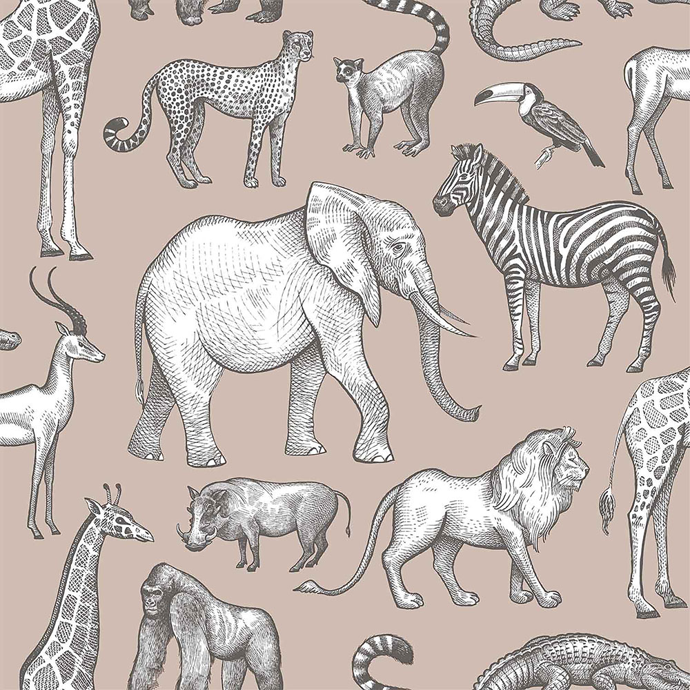 Old pink non-woven wallpaper, Animals from Africa - elephants, monkeys, zebras, birds, crocodiles.