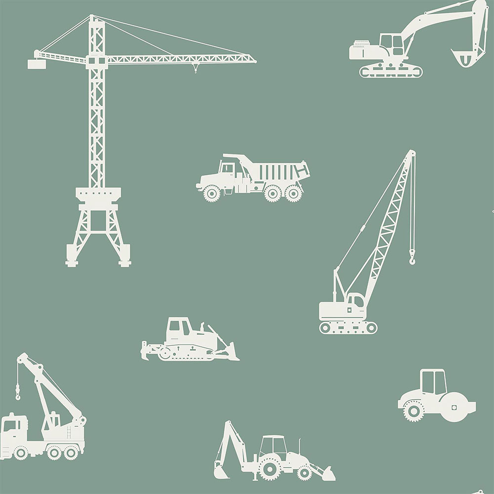 Green non-woven wallpaper for boys - cars, excavators, cranes and tractors.