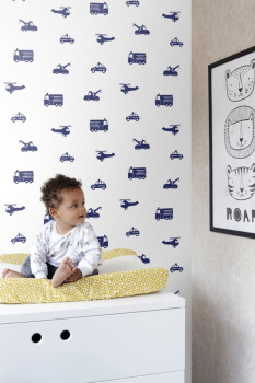 Non-woven wallpaper, wallpaper for boys, white background, dark blue cars, cranes and helicopters.