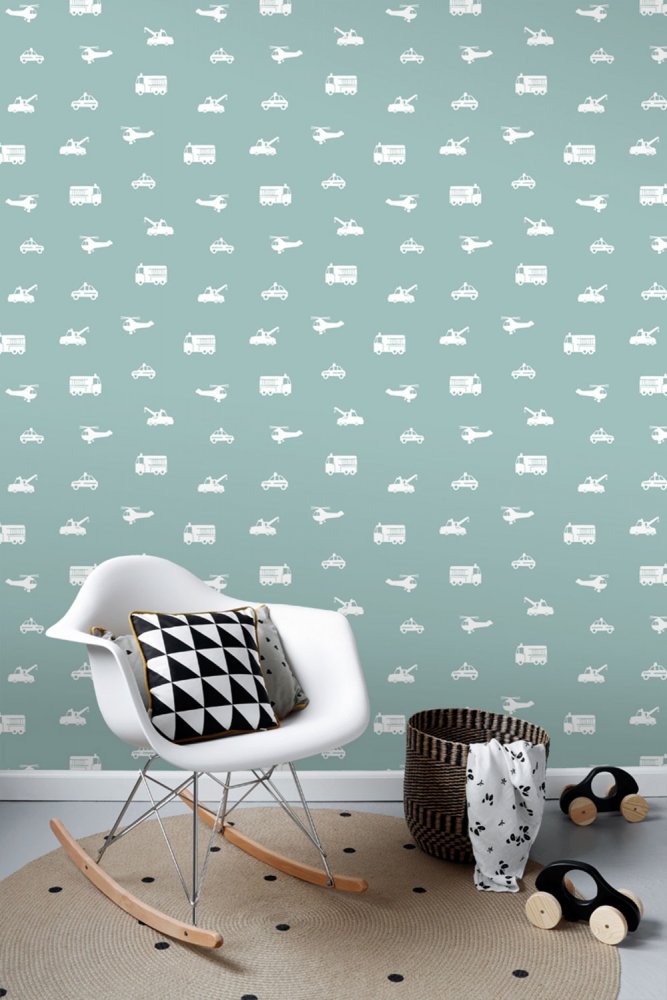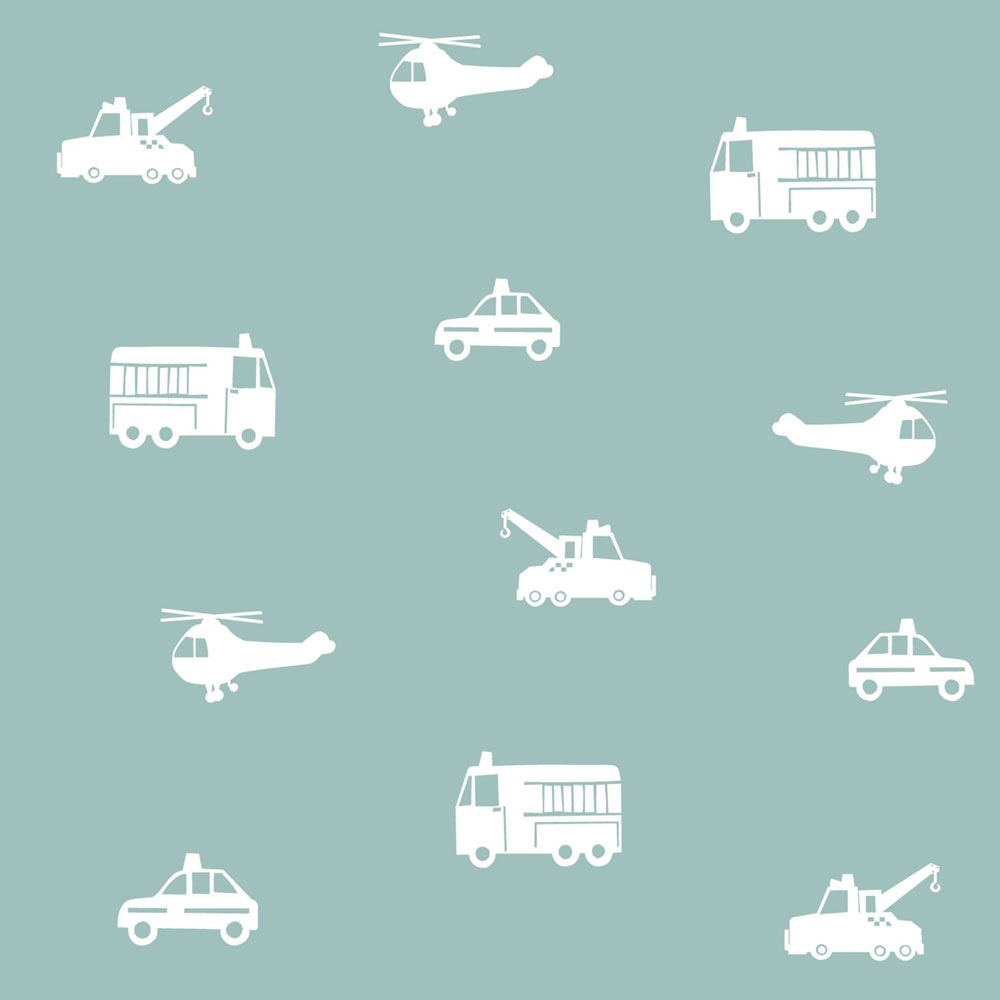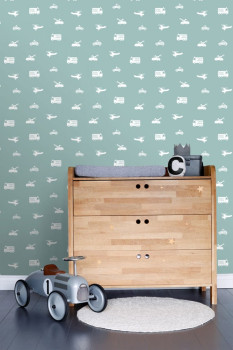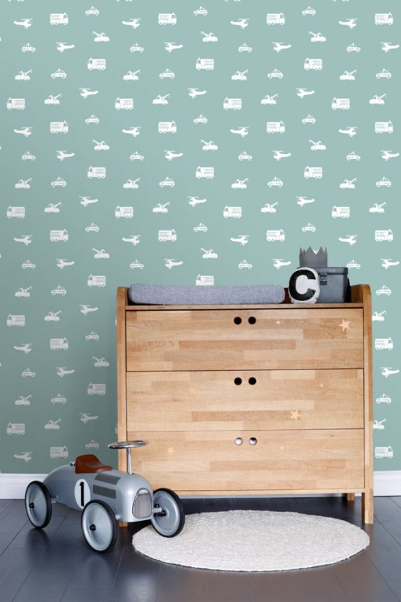 Turquoise non-woven wallpaper, wallpaper for boys with cars, cranes and helicopters.
