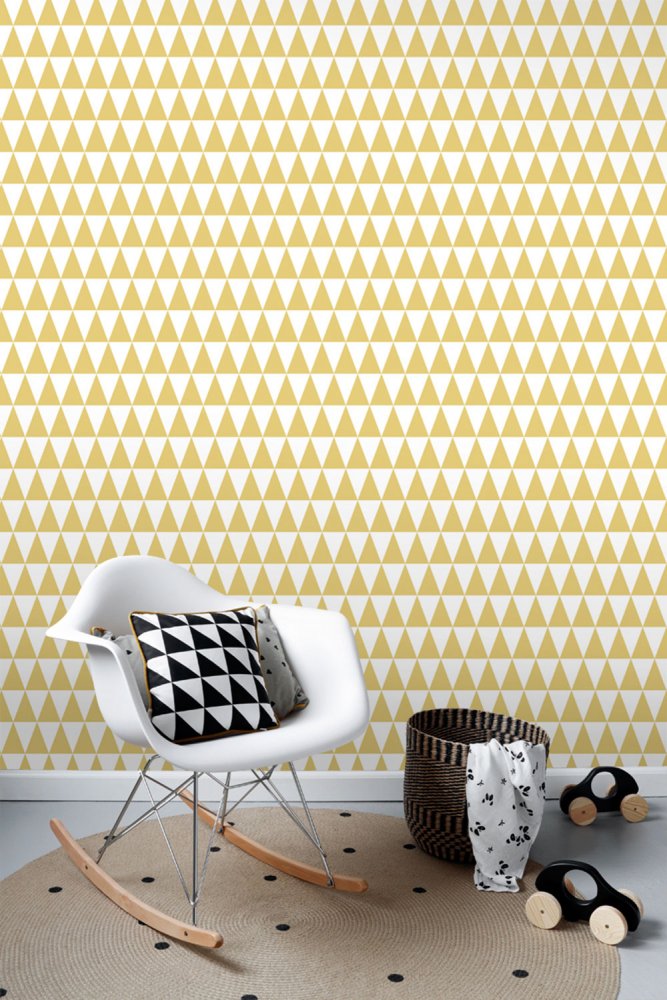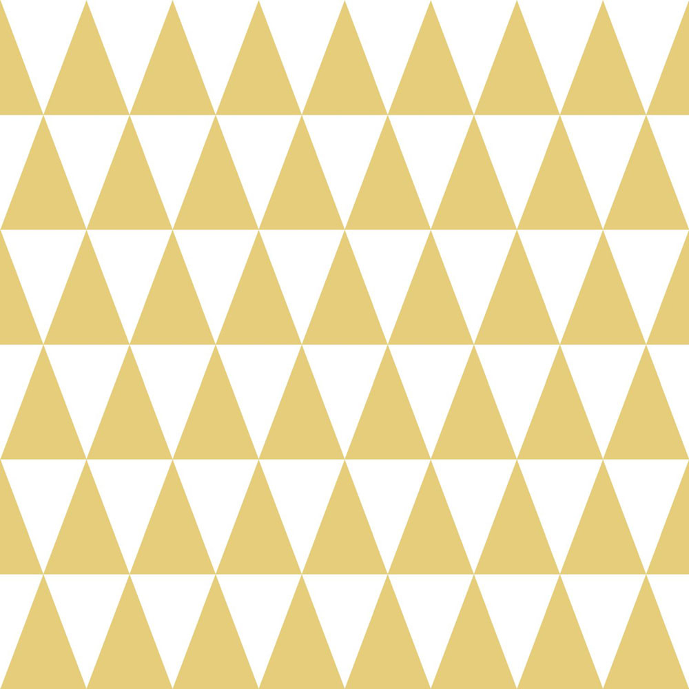 Non-woven geometric pattern wallpaper, white and ocher triangles.