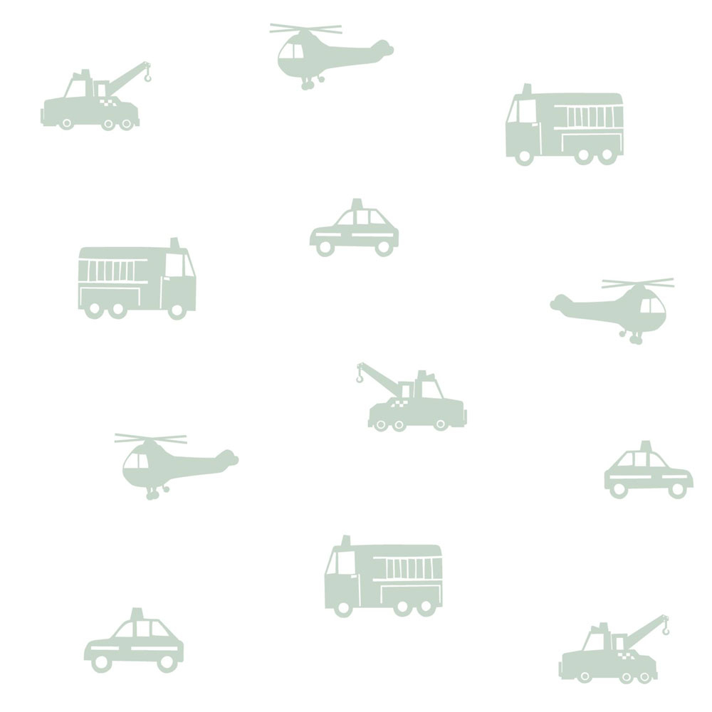 Non-woven wallpaper for boys, green cars, helicopters on a white background.