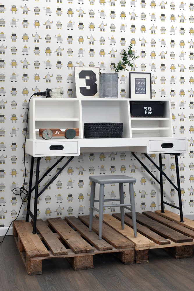 Non-woven children's wallpaper, wallpaper for boys, robots in shades of ocher, gray and black.