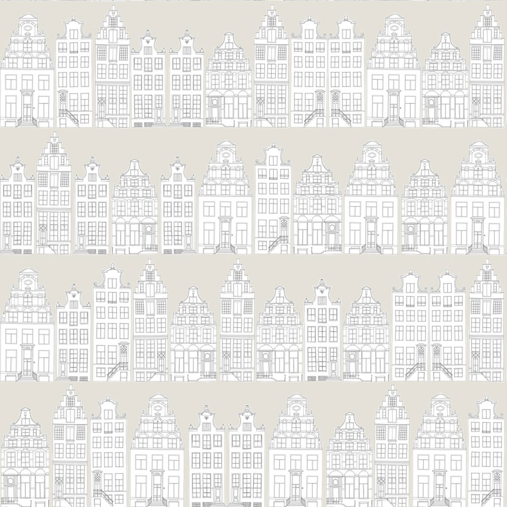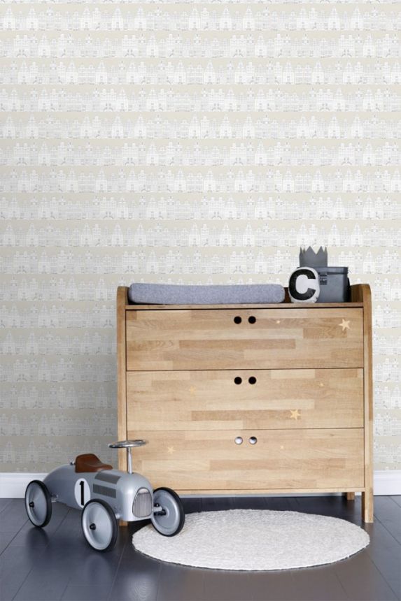 Non-woven wallpaper, drawn historical houses on a gray-cream background.