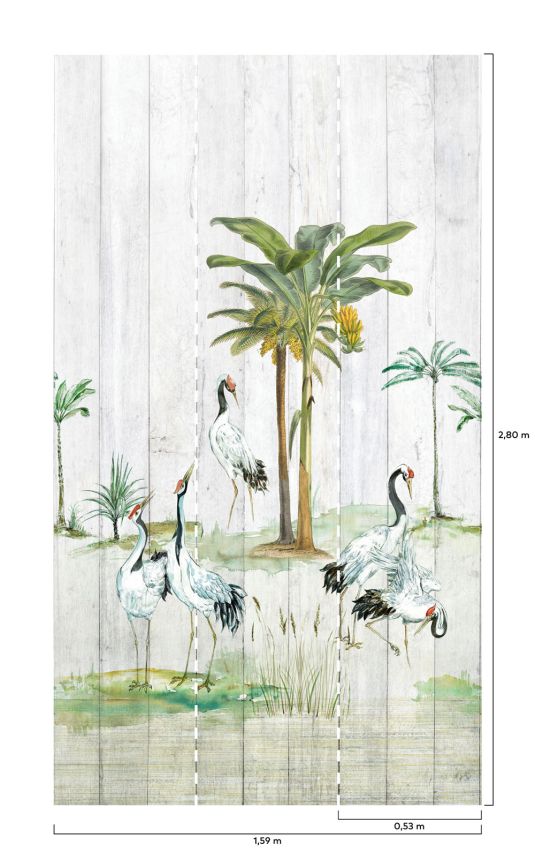 Tropical Wood - design of herons and palm trees on wood planks. The wallpaper has a follow-up pattern, for a larger width just buy another piece.