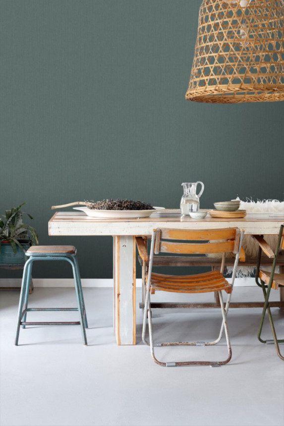 Textured non-woven wallpaper, imitation coarse green fabric.