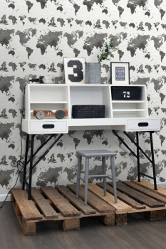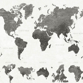 Non-woven world map wallpaper in shades of gray and black.