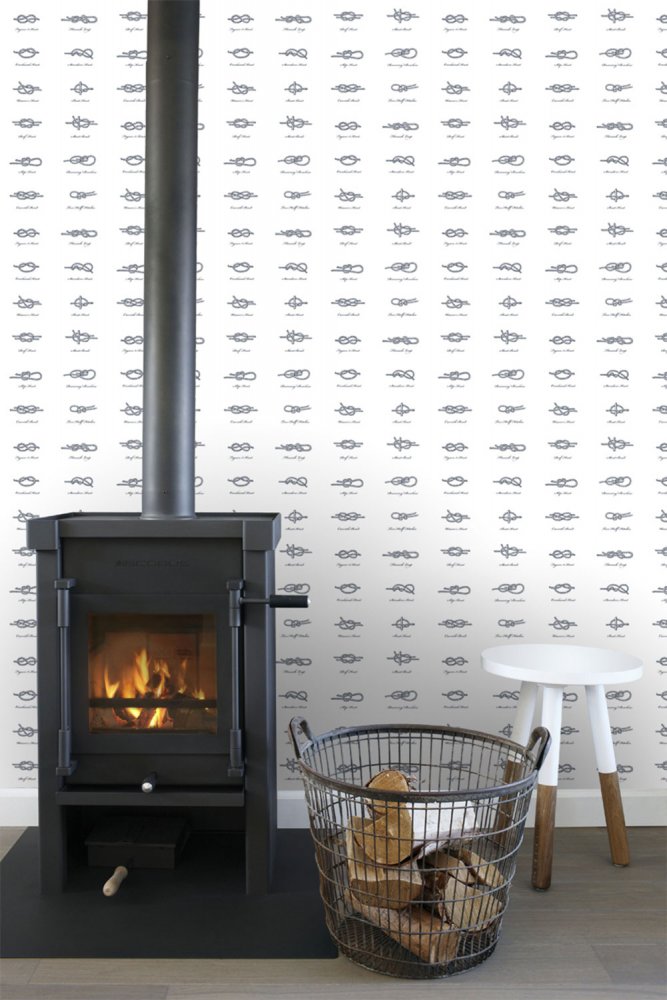 Non-woven white wallpaper, blue motifs of knots, ropes.