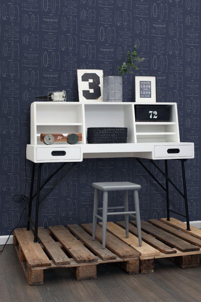 Dark blue non-woven wallpaper, white drawings of surfboards.