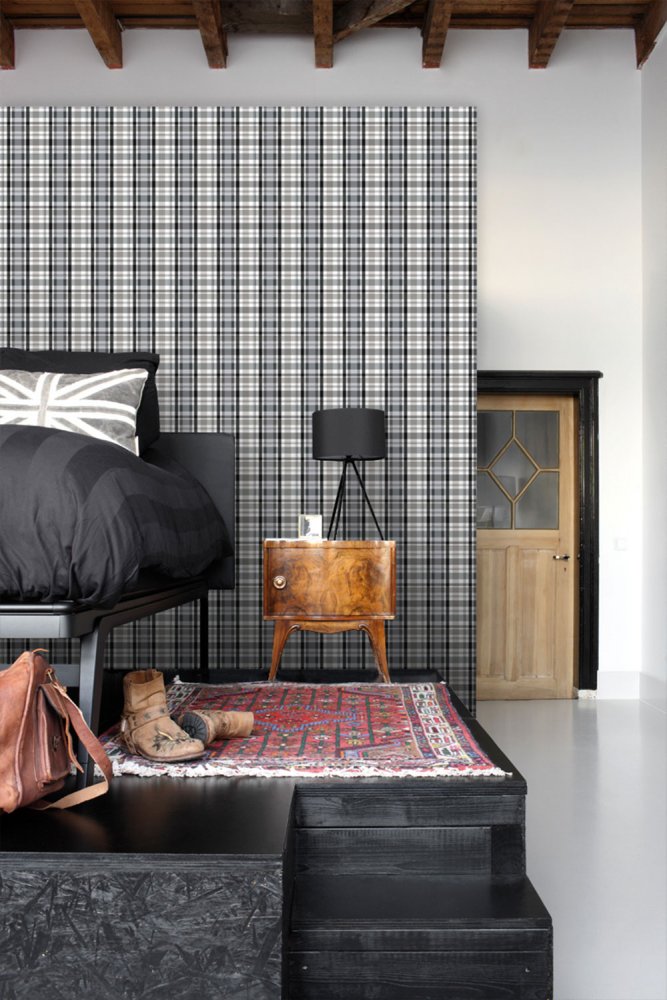 Non-woven wallpaper, checkered pattern in shades of gray, black and white.