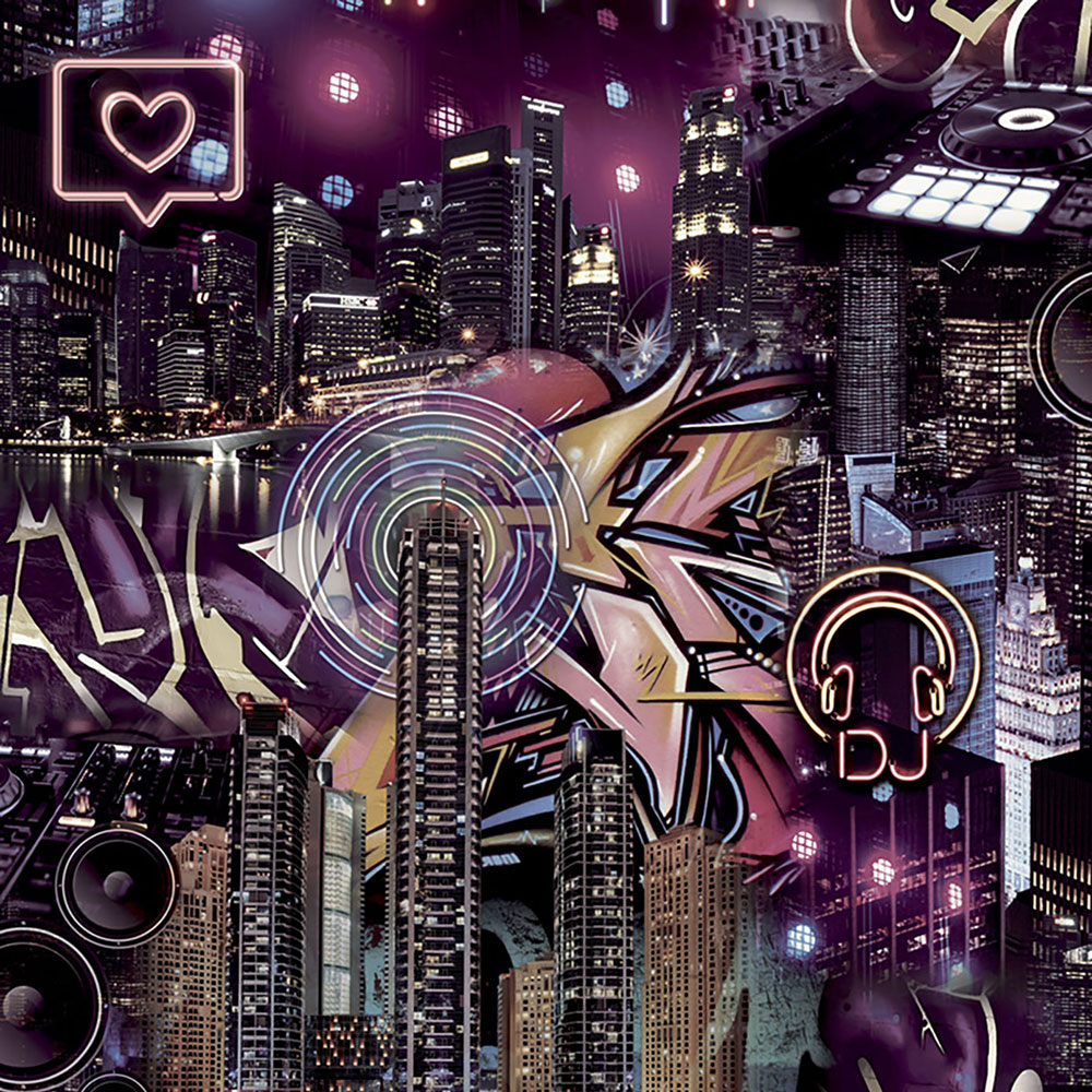 Wallpaper Glow in the dark - Night city - parts of the pattern glow in the dark.