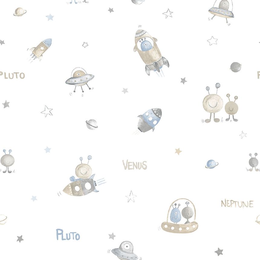 Paper wallpaper for boys, themes of space, rockets, flying saucers and Martians.