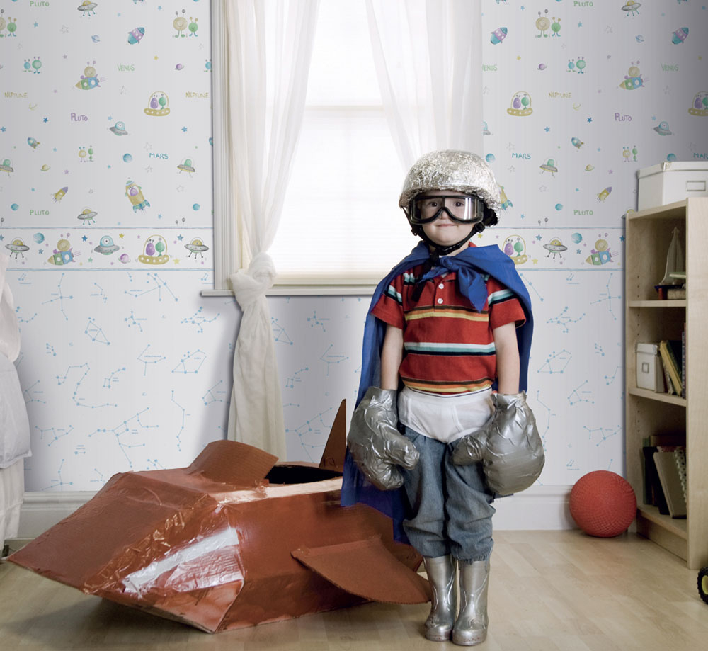 Paper wallpaper for boys, themes of space, rockets, flying saucers and Martians.