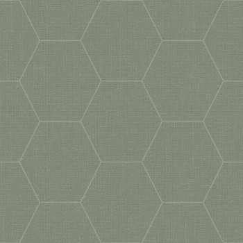 Non-woven, geometric design wallpaper with a fine fabric texture, contours of hexagons melange green and gray-green.