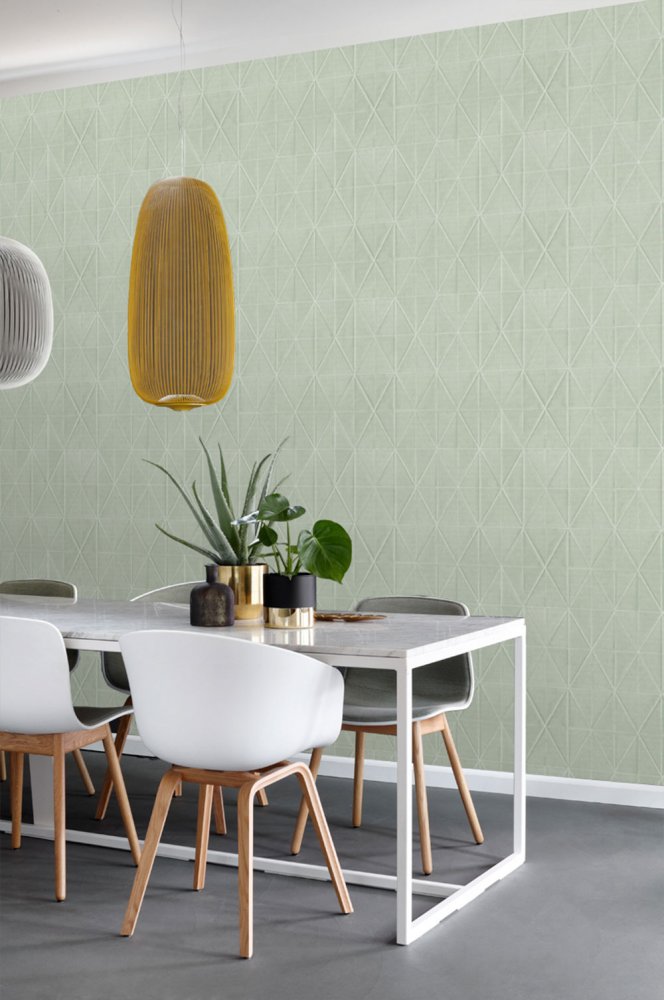 Green non-woven wallpaper, folded origami pattern.